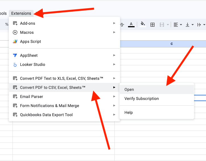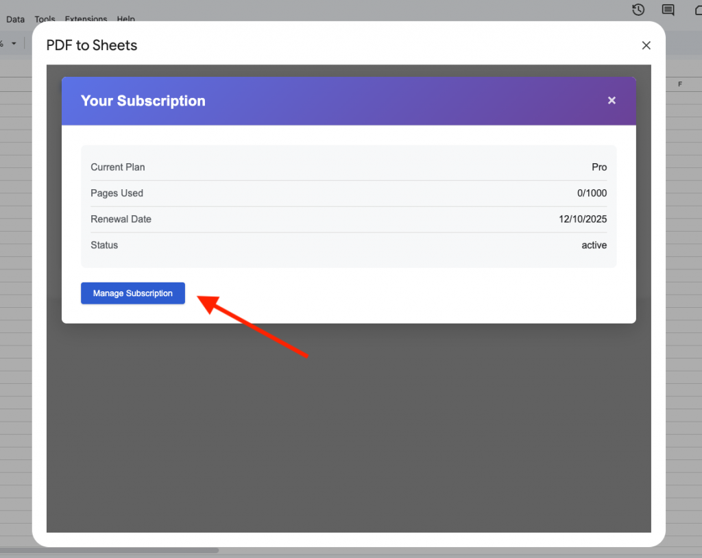 Open the addon inside Google Sheets. If you uninstalled the addon, you must reinstall the addon to access the menu to manage your subscription